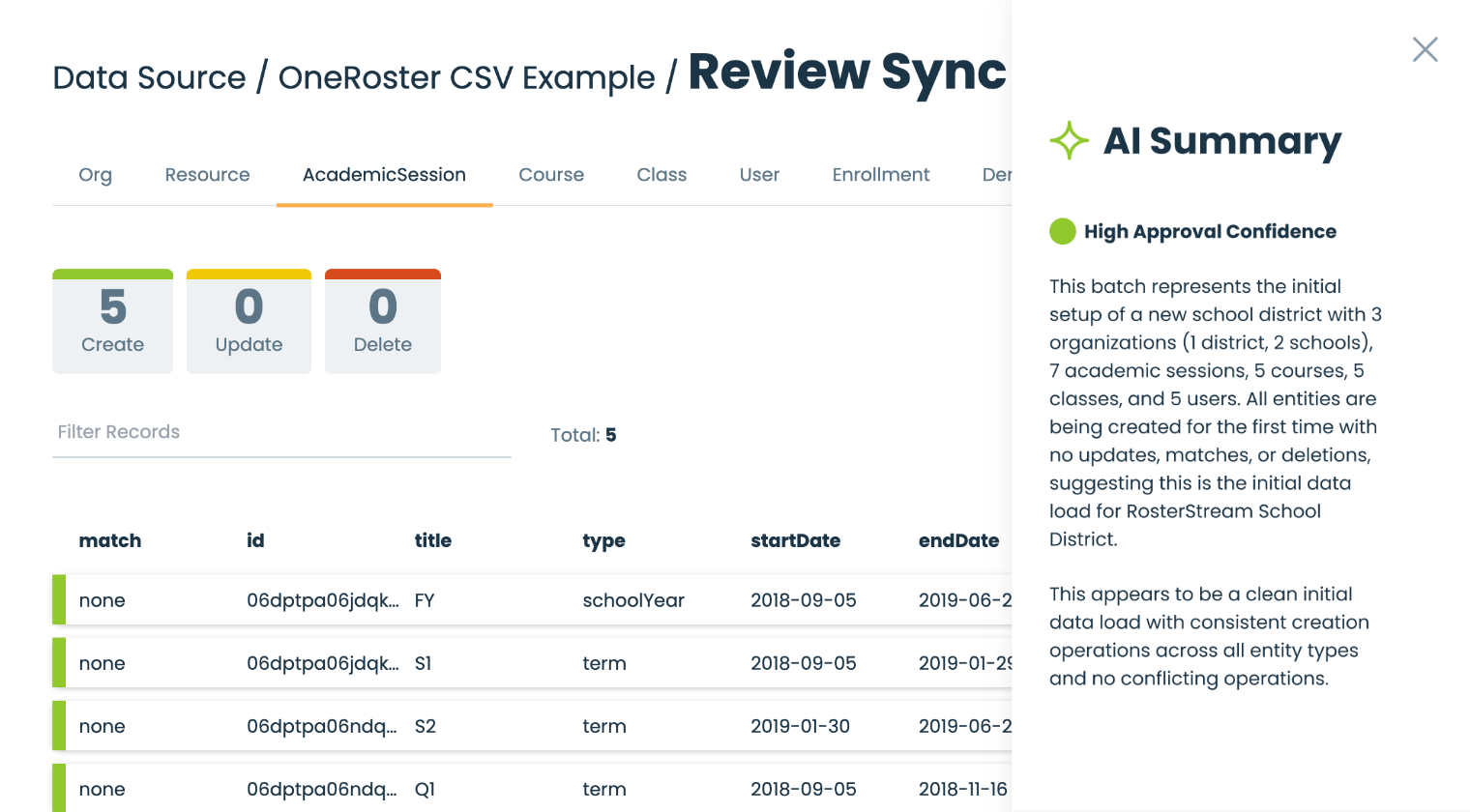 RosterStream is the only AI-first rostering platform. Roster Intelligence powers every part of RosterStream, from automatically mapping SIS data, to enabling agentic control via our MCP API. Roster Intelligence delivers AI-generated insights across syncs, monitoring, and operations.
